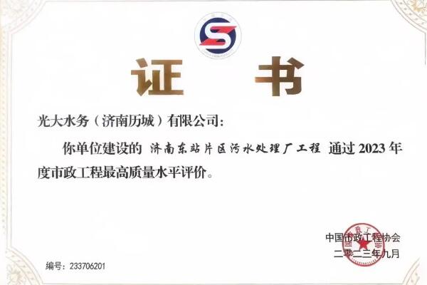 近日,光大水务济南东站片区污水处理厂工程项目在众多竞争者中脱颖而出,荣获中国市政工程协会颁发的“2023年度市政工程最高质量水平评价”奖项。这一荣誉的获得既是对光大水务企业品牌的高度肯定,也是对该项目建设质量的极高认可。 今年正值光大水务创立20周年,公司始终秉承高标准、严要求、建精品的工程建设理念,全力以赴...