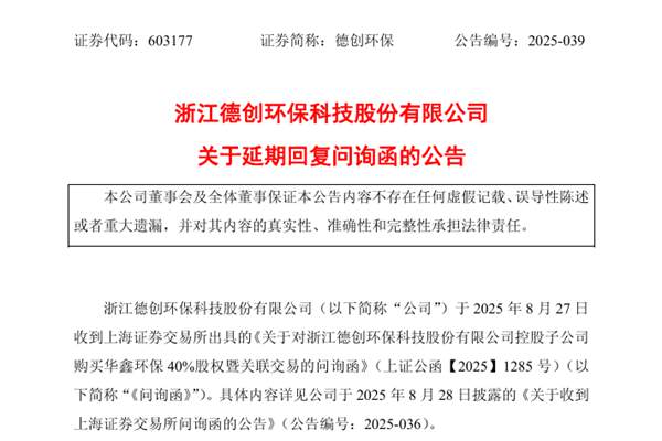 浙江德创环保科技股份有限公司(简称:德创环保)公告称,公司于2025年8月27日收到上海证券交易所出具的《关于对浙江德创环保科技股份有限公司控股子公司购买华鑫环保40%股权暨关联交易的问询函》(上证公函【2025】1285号)(下称《问询函》),为确保回复内容的准确性、完整性,经申请,公司拟延期不超过5个交易日回复《问询函》,并按照规...