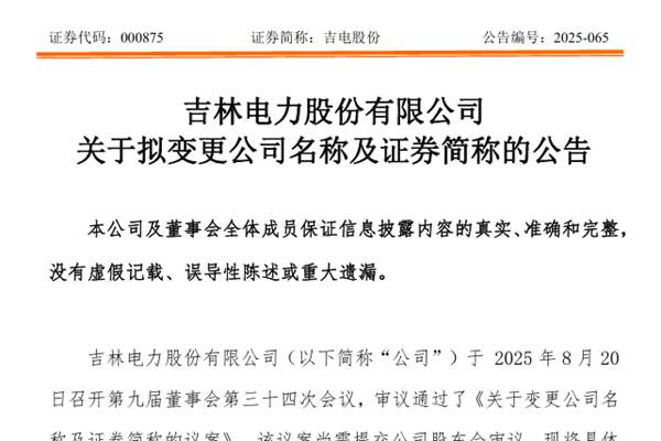 吉林电力股份有限公司(简称“吉电股份”)近日公告称,公司拟变更名称及证券简称,更名为“国家电投集团绿色能源发展股份有限公司”,简称变为“电投绿能”。图源:吉电股份公告 吉电股份表示,自公司转型发展新能源以来,业务重心已从传统能源加速转向绿色、低碳、可再生能源,新...