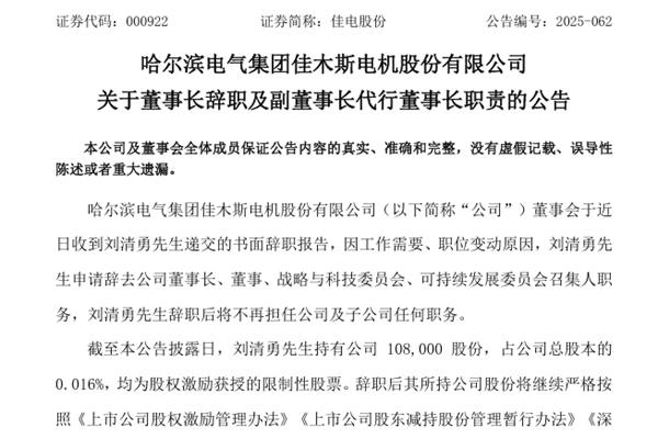 8月11日,哈尔滨电气集团佳木斯电机股份有限公司(简称:佳电股份)发布公告称,公司董事会于近日收到刘清勇先生递交的书面辞职报告,因工作需要、职位变动原因,刘清勇先生申请辞去公司董事长、董事、战略与科技委员会、可持续发展委员会召集人职务,刘清勇先生辞职后将不再担任公司及子公司任何职务。 根据《公司法》《公司章程》等有关规定,刘清勇先生...