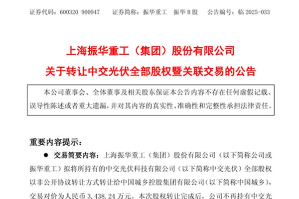 上海振华重工(集团)股份有限公司(简称:振华重工)近日公告称,公司拟将持有的中交光伏科技有限公司(下称“中交光伏”)全部股权以非公开协议转让方式转让给中国城乡控股集团有限公司(下称“中国城乡”),交易对价为人民币3,438.24万元。本次股权转让完成后,振华重工不再持有中交光伏股权。 ...