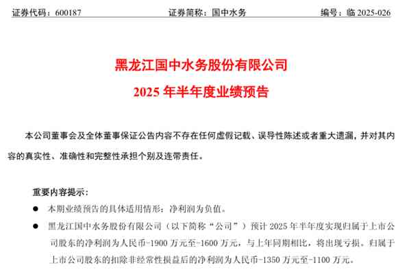 黑龙江国中水务股份有限公司(简称:国中水务)近日发布《2025年半年度业绩预告》。报告期内,国中水务预计实现归属于上市公司股东的净利润为人民币-1900万元至-1600万元,与上年同期相比,将出现亏损。归属于上市公司股东的扣除非经常性损益后的净利润为人民币-1350万元至-1100万元。 国中水务分析认为,本期业绩预亏的主要原因包括...