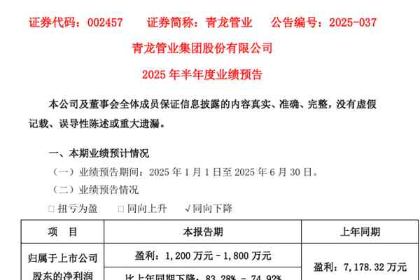 青龙管业集团股份有限公司(简称:青龙管业)近日发布《2025年半年度业绩预告》。报告期内,青龙管业预计实现归属于上市公司股东的净利润盈利1,200万元–1,800万元,同比下降83.28%-74.92%;扣除非经常性损益后的净利润盈利870万元–1,300万元,同比下降86.59%-79.97%;基本每股收益盈...