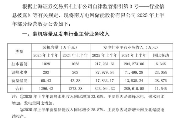 2025年07月16日,南方电网储能股份有限公司发布《2025年上半年部分经营数据公告》。图源:南网储能公告 装机容量达到1296.42万千瓦,较2024年上半年增加了23.04万千瓦;主营业务收入32.3亿元,同比增长11.54%。其中,新型储能装机容量65.42万千瓦,同比增长了54.4%左右,营业收入 17,833.17万元,...