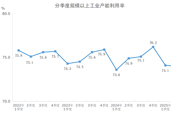 2025年二季度,全国规模以上工业产能利用率为74.0%,比上季度下降0.1个百分点,比上年同期下降0.9个百分点。 分三大门类看,2025年二季度,采矿业产能利用率为72.7%,制造业产能利用率为74.3%,电力、热力、燃气及水生产和供应业产能利用率为71.5%。 分主要行业看,2025年二季度,煤炭开采和洗选业产能利用率为69...
