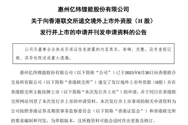 2025年06月30日,惠州亿纬锂能股份有限公司发布《关于向香港联交所递交境外上市外资股(H 股)发行并上市的申请并刊发申请资料的公告》。图源:亿纬锂能公告 惠州亿纬锂能股份有限公司已于2025年6月30日向香港联合交易所有限公司递交了发行境外上市外资股(H股)并在香港联交所主板挂牌上市的申请,并于同日在香港联交所网站刊登了本次发行...
