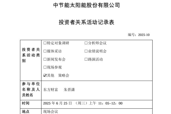2025年06月26日,中节能太阳能股份有限公司发布《投资者关系活动记录表》。图源:太阳能公告 一、就公司2024年度整体运营情况及行业情况进行交流。 二、提问及公司回复情况 1、公司当前配储情况及技术路线。 答: 公司目前储能主要为光伏电站配套储能,合计规模约1500MWh,涵盖磷酸铁锂、全钒液流以及超级电容储能类型,后续...