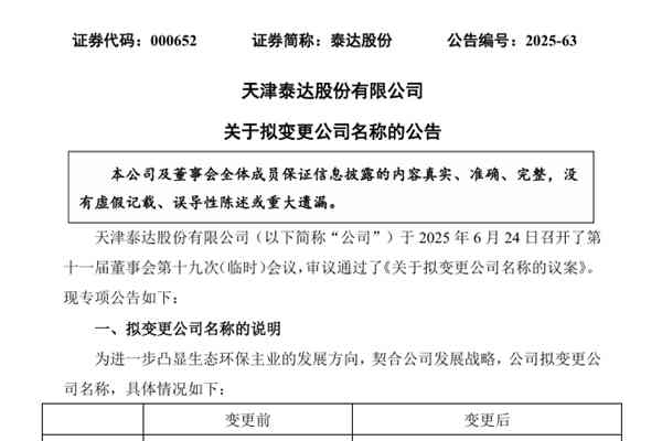 天津泰达股份有限公司(简称:泰达股份)近日公告称,为进一步凸显生态环保主业的发展方向,契合公司发展战略,公司拟变更公司名称,由“天津泰达股份有限公司”变更为“天津泰达资源循环集团股份有限公司”,英文名称由“Tianjin TEDA Co.,Ltd.”变更为&ldq...