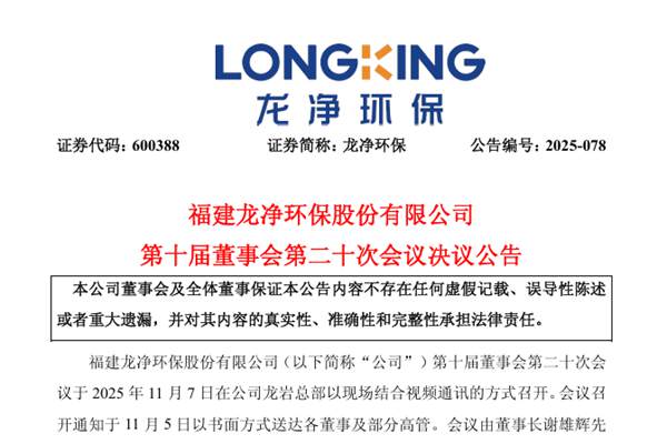 福建龙净环保股份有限公司(简称:龙净环保)于2025年11月7日召开第十届董事会第二十次会议,会上审议通过了《关于选举公司第十届董事会董事长的议案》,全票选举谢雄辉先生担任董事长,任期自第十届董事会第二十次会议审议通过之日起至第十届董事会任期届满之日止。 此外,龙净环保第十届董事会专门委员会迎来调整,下设战略、审计、提名、薪酬与考核...