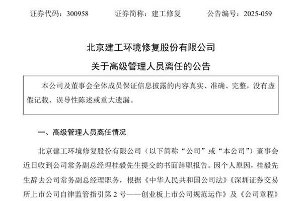 北京建工环境修复股份有限公司(简称:建工修复)公告称,公司董事会近日收到常务副总经理桂毅先生提交的书面辞职报告。因个人原因,桂毅先生辞去公司常务副总经理职务。桂毅先生原定任期为2023年12月27日至2026年10月30日,辞职后桂毅先生将不在公司及控股子公司担任职务。图源:建工修复公告 申明:本站发布此信息的目的在于传播更多行业信...
