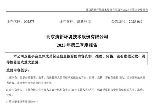 北京清新环境技术股份有限公司(简称:清新环境)近日发布《2025年第三季度报告》。2025年前三季度,实现营业总收入60.85亿元,同比增长3.41%;归母净利润1952.63万元,同比下降67.15%;扣非净利润796.55万元,同比下降79.49%;经营活动产生的现金流量净额为6.34亿元,同比增长4.96%。图源:清新环境公告 ...