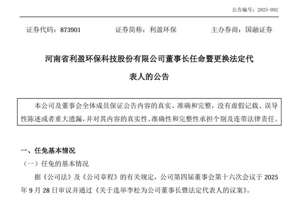 新三板上市公司河南省利盈环保科技股份有限公司(简称:利盈环保)公告称,公司第四届董事会第十六次会议于 2025年 9 月 28 日审议并通过《关于选举李松为公司董事长暨法定代表人的议案》。任命李松女士为公司董事长,任职期限至第四届董事会任期届满之日止,自 2025年 9 月 28 日起生效。上述任命人员持有公司股份 0 股,占公司股本...