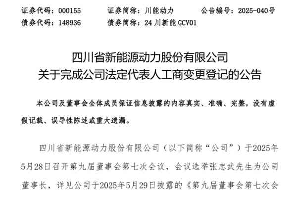 四川省新能源动力股份有限公司(简称:川能动力)公告称,公司近日已完成法定代表人的工商变更登记手续,公司法定代表人已变更为张忠武先生,并取得成都市市场监督管理局颁发的新营业执照。 据悉,2025年5月28日,川能动力召开第九届董事会第七次会议,会议选举张忠武先生为公司董事长。图源:川能动力公告 申明:本站发布此信息的目的在于传播更多...