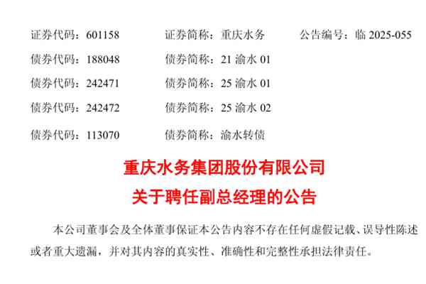 重庆水务集团股份有限公司(简称:重庆水务)近日公告称,公司同意聘任刘继成先生为公司副总经理,任期自本次董事会审议通过之日起,至第六届董事会到期之日止。图源:重庆水务公告 申明:本站发布此信息的目的在于传播更多信息,与本站立场无关。并且郑重提示所有阅读者,股市有风险,投资需谨慎,本文不作为任何投资的参考意见和依凭。...