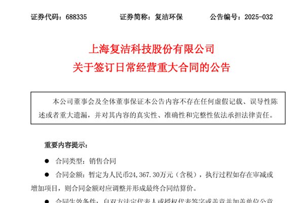 上海复洁科技股份有限公司(简称:复洁环保)公告称,公司近日与与北京市市政工程设计研究总院有限公司签署了《白龙港污水处理厂扩建三期工程BLG3-2.3标污泥干化造粒系统、除臭系统及其配套设备采购及伴随服务合同》,合同金额暂定为人民币24,367.30万元(含税),执行过程如存在审减或增加项目,则合同金额对应调整并形成最终合同结算价。 ...