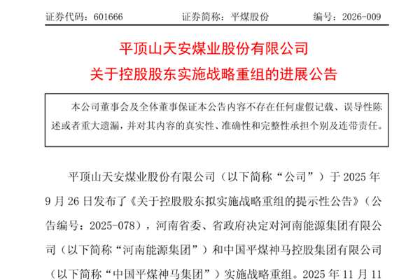 平顶山天安煤业股份有限公司(简称:平煤股份)近日公告称,1月13日,公司收到控股股东中国平煤神马控股集团有限公司(以下简称“中国平煤神马集团”)书面通知,获悉河南省国资委与河南能源集团有限公司(以下简称“河南能源集团”)、中国平煤神马集团于通知当日正式签署《中国平煤神马控股集团有限公司增...