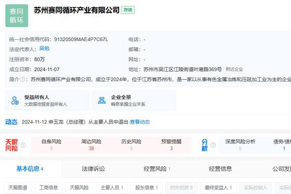 近日,苏州赛同循环产业有限公司成立,法定代表人为吴勉,注册资本80万元,经营范围如下: 【一般项目】通用设备制造(不含特种设备制造);资源循环利用服务技术咨询;再生资源回收(除生产性废旧金属);再生资源加工;再生资源销售;货物进出口;技术进出口;家具制造;家具销售;户外用品销售;塑料制品制造;塑料制品销售;橡胶制品制造;橡胶制品销售...