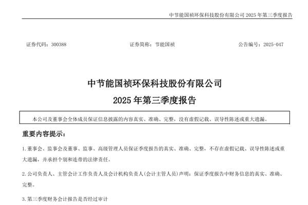 中节能国祯环保科技股份有限公司(简称:节能国祯)近日发布《2025年第三季度报告》。2025年前三季度,节能国祯实现营业总收入25.17亿元,同比下降7.79%;归母净利润2.54亿元,同比下降1.50%;扣非净利润2.56亿元,同比下降10.62%;经营活动产生的现金流量净额为3.63亿元,同比增长32.27%。图源:节能国祯公告 ...
