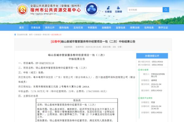 继32亿元河北省保定市曲阳县环卫特许经营项目之后,粤丰粤展首次进军安徽省环卫领域,顺利开局,成功中标约18亿元的城市管家服务特许经营合同。 2024年1月4日,粤丰粤展联合四川佳洁园成功中标安徽省宿州市砀山县城市管家服务特许经营项目一包,中标金额7179万元/年,服务期限25年,合同总额达17.9475亿元。 项目服务范围包括砀山...