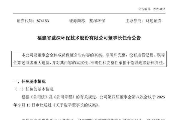 新三板上市企业福建省蓝深环保技术股份有限公司(简称:蓝深环保)公告称,公司第四届董事会第八次会议于2025年9月15日审议通过《关于选举董事长的议案》。选举黄东胜先生为公司董事长,任职期限至第四届董事会届满之日止,自2025年9月15日起生效。 任命原因是:原董事长黄建洪先生工作调动,不在担任公司董事长职务。图源:蓝深环保公告 公...
