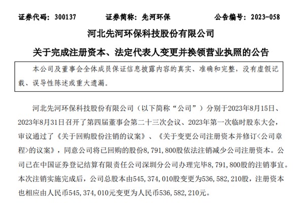 《河北先河环保科技股份有限公司 关于完成注册资本、法定代表人变更并换领营业执照的公告》近日发布。公告显示,先河环保最近完成了的工商变更登记手续,取得了石家庄高新技术产业开 发区行政审批局换发的《营业执照》。 ①赵顺先生成为公司第五届董事会董事长, 任期三年,自董事会通过之日起至第五届董事会届满之日止。 ②公司分别于2023年8月1...