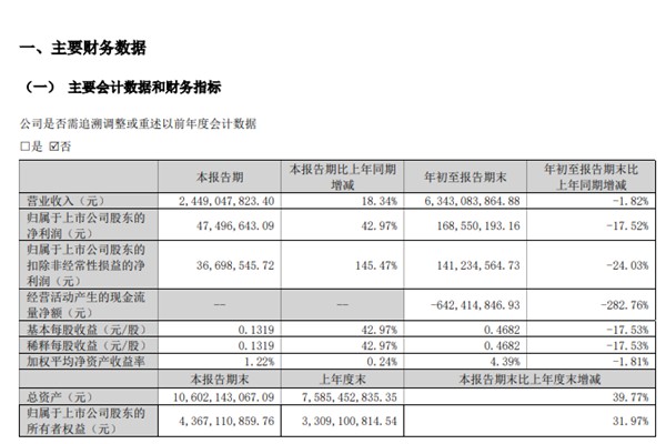 近日,广东飞南资源利用股份有限公司发布2023年第三季度报告,主要财务指标如下↓ 飞南资源2023年第三季度营业收入24.49亿元,较上年同期增长18.34%;归属于上市公司股东的净利润4749.66万元,较上年同期增长42.97%。2023年1-9月,公司总营收63.43亿元,净利润1.69亿元,基本每股收益0.4682...