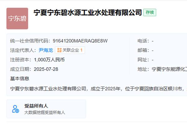 7月28日,宁夏宁东碧水源工业水处理有限公司成立,注册资本1000万元,经营范围包含: 【一般项目】新型膜材料制造;新型膜材料销售;生态环境材料制造;生态环境材料销售;生态环境监测及检测仪器仪表制造;生态环境监测及检测仪器仪表销售;污水处理及其再生利用;水污染治理;污泥处理装备制造;水环境污染防治服务;环境应急技术装备销售;智能水务...