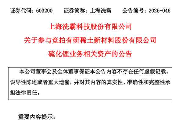 7月8日,上海洗霸科技股份有限公司(简称:上海洗霸)发布公告称,公司计划在董事会决策范围内参与竞拍有研稀土新材料股份有限公司(下称“有研稀土”)公开挂牌转让的硫化锂业务相关资产,以推动固态电池先进材料业务发展。 据悉,有研稀土拟通过产权交易所挂牌转让硫化锂业务相关资产,6月27日,有研稀土持有的硫化锂业务相关...