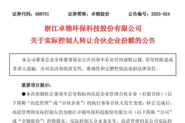 浙江卓锦环保科技股份有限公司(简称:卓锦股份)近日公告称,公司实际控制人卓未龙先生分别与6名公司骨干员工签署了《出资份额转让协议》,拟向受让方转让其持有的杭州高廷企业管理合伙企业(有限合伙)(下称“高廷管理”)合计263,160元的出资份额。受让完成后,6名受让方合计通过高廷管理享有卓锦股份1,315,800股...