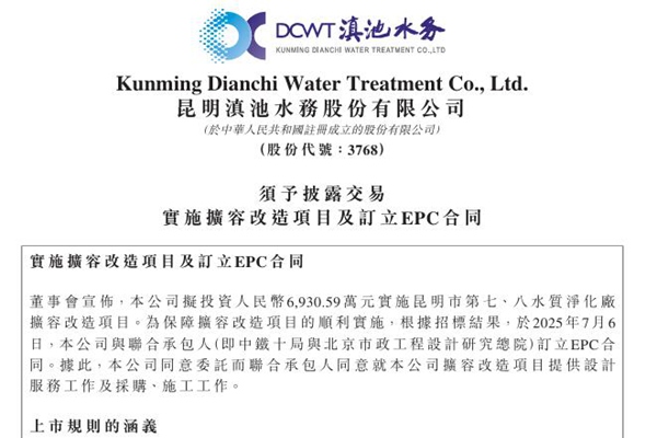2025年07月08日,昆明滇池水务股份有限公司发布《须予披露交易 实施扩容改造项目及订立EPC合同》。图源:滇池水务公告 拟投资人民币6,930.59万元实施昆明市第七、八水质净化厂扩容改造项目。为保障扩容改造项目的顺利实施,根据招标结果,于2025年7月6日,公司与联合承包人(即中铁十局与北京市政工程设计研究总院)订立EPC合同...