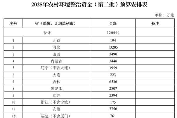 近日,财政部发布《关于下达2025年农村环境整治资金(第二批)预算的通知》,共计12亿元。 详情如下↓ 财政部关于下达2025年农村环境整治资金(第二批)预算的通知 财资环〔2025〕62号 各省、自治区、直辖市、计划单列市财政厅(局),新疆生产建设兵团财政局: 为促进农村生态环境质量改善,加快推进农村环境整治工作...