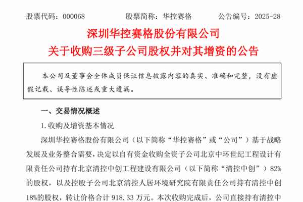 深圳华控赛格股份有限公司(简称:华控赛格)近日公告称,基于战略发展及业务整合需要,公司决定以自有资金收购全资子公司北京中环世纪工程设计有限责任公司持有北京清控中创工程建设有限公司(下称“清控中创”)82%的股权,以及控股子公司北京清控人居环境研究院有限责任公司持有清控中创18%的股权,转让价格合计918.33万...