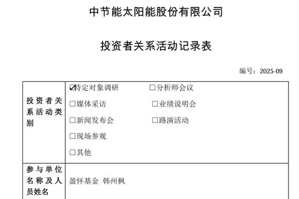 2025年06月12日,中节能太阳能股份有限公司发布《投资者关系活动记录表》。图源:太阳能公告 一、提问及公司回复情况 1、136号文对公司的影响。 答: 136号文及其实施细则的出台是当前整个新能源行业关注的热点和焦点,它对行业的未来发展至关重要。目前除山东、广东、广西、内蒙外,其他省、直辖市、自治区的136号文实施细则尚未...