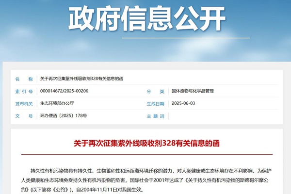 关于再次征集紫外线吸收剂328有关信息的函 持久性有机污染物具有持久性、生物蓄积性和远距离环境迁移的潜力,对人类健康或生态环境存在不利影响。为保护人类健康和生态环境免受持久性有机污染物的危害,国际社会于2001年达成了《关于持久性有机污染物的斯德哥尔摩公约》(以下简称《公约》),自2004年11月11日对我国生效。 《公约》在附件A(...