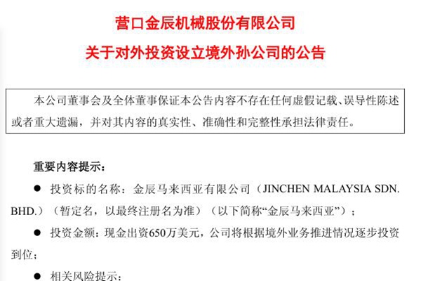 2025年05月31日,营口金辰机械股份有限公司发布《关于对外投资设立境外孙公司的公告》。图源:金辰股份公告 为完善落实营口金辰机械股份有限公司海外战略布局,更好地贴近市场和客户、响应客户需求,促进公司稳健经营和持续发展,加快全球化进程,提升公司的核心竞争力和未来盈利能力,公司拟通过全资子公司金辰新加坡有限公司(JINCHENSGP...