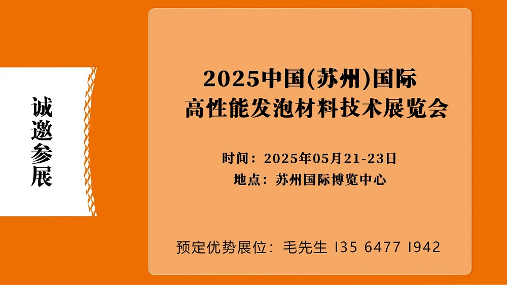2025中国(苏州)国际高性能发泡材料技术展览会 CHINA (SUZHOU) INTERNATIONAL HIGH PERFORMANCE FOAM MATERIAL TECHNOLOGY EXHIBITION 时间:2025年5月21-23日 地点:苏州国际博览中心(苏州工业园区苏州大道东688号) 【展会介绍】 随着全球对可持续...