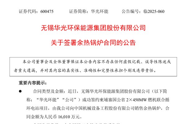 无锡华光环保能源集团股份有限公司(简称:华光环能)公告称,近日,公司成功签约柬埔寨国公省2×450MW燃机联合循环电站项目,由我公司向中国机械设备工程股份有限公司销售余热锅炉,合同金额为人民币16,010万元。项目建成后,年发电量预计将占柬埔寨全国总发电量的四分之一,系当地标杆工程,为华光环能后续深化区域合作、拓展东南亚清...
