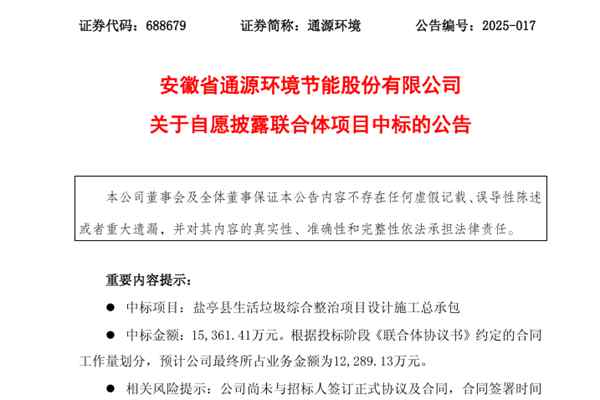安徽省通源环境节能股份有限公司(简称:通源环境)近日公告称,公司所在联合体成功中标“盐亭县生活垃圾综合整治项目设计施工总承包”,中标金额:15,361.41万元,根据投标阶段《联合体协议书》约定的合同工作量划分,预计公司最终所占业务金额为12,289.13万元。 1、项目名称:盐亭县生活垃圾综合整治项目设计施...