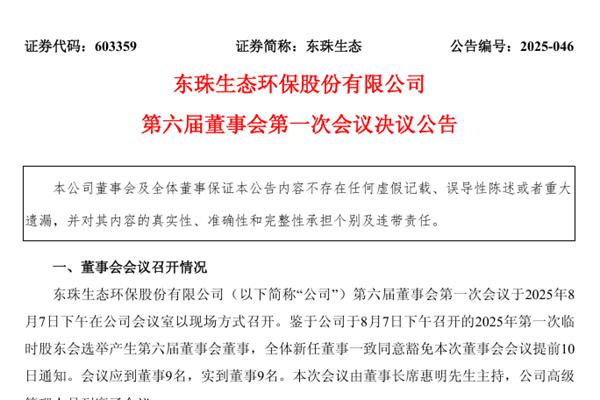 东珠生态环保股份有限公司(简称:东珠生态)公告称,公司近日召开了第六届董事会第一次会议,审议并通过了如下议案: 1、《关于选举公司第六届董事会董事长的议案》 同意选举席惠明先生为公司第六届董事会董事长,任期自本次董事会审议通过之日起至第六届董事会届满为止。 2、《关于设立公司第六届董事会专门委员会及其人员组成的议案》 2.1审...