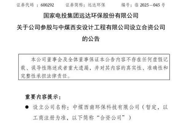 7月26日,国家电投集团远达环保股份有限公司(简称:远达环保)公告称,拟与中煤西安设计工程有限公司(简称“中煤西安”)合作成立合资公司——中煤西南环保科技有限公司。合资公司注册地在重庆,公司持股49%,中煤西安持股51%。合资公司初始注册资本金500万元,后续根据项目投资进度,适时将注册...