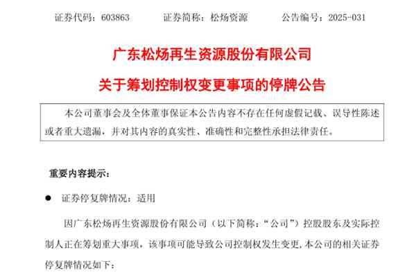 广东松炀再生资源股份有限公司(简称:松炀资源)近日公告称,因控股股东及实际控制人正在筹划重大事项,该事项可能导致公司控制权发生变更,所以公司将于2025年6月27日开市起停牌,停牌时间不超过2个交易日。图源:松炀资源公告 申明:本站发布此信息的目的在于传播更多信息,与本站立场无关。并且郑重提示所有阅读者,股市有风险,投资需谨慎,本文...
