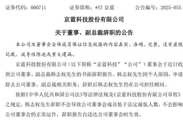 京蓝科技股份有限公司(简称:*ST京蓝)近日公告称,因个人原因,公司董事、副总裁韩志权先生提交了书面辞职报告,申请辞去公司董事、副总裁相关职务,辞职后韩志权先生仍在公司担任顾问。图源:*ST京蓝公告 申明:本站发布此信息的目的在于传播更多信息,与本站立场无关。并且郑重提示所有阅读者,股市有风险,投资需谨慎,本文不作为任何投资的参考意...