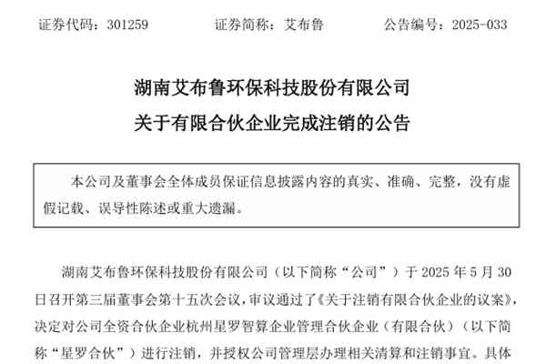 湖南艾布鲁环保科技股份有限公司(简称:艾布鲁)近日公告称,近日,公司收到了杭州市上城区市场监督管理局出具的《注销证明》,准予杭州星罗智算企业管理合伙企业(有限合伙)(下称“星罗合伙”)注销登记。至此,星罗合伙注销登记手续已办理完毕。 艾布鲁表示,星罗合伙注销完成后,不再纳入公司合并财务报表范围且不会对公司的财...