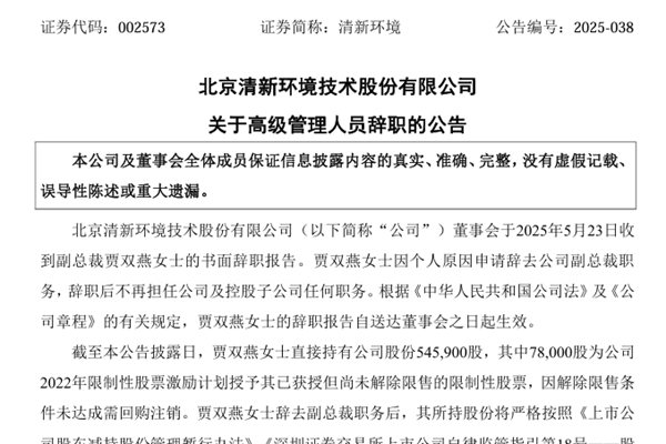 北京清新环境技术股份有限公司(简称:清新环境)公告称,公司近日收到了副总裁贾双燕女士的书面辞职报告。贾双燕女士因个人原因申请辞去公司副总裁职务,辞职后不再担任公司及控股子公司任何职务。 截至本公告披露日,贾双燕女士直接持有清新环境股份545,900股,其中78,000股为公司2022年限制性股票激励计划授予其已获授但尚未解除限售的限...