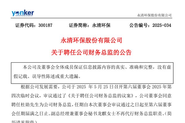 永清环保股份有限公司(简称:永清环保)近日公告称,公司董事会同意聘任杜勋先生为公司财务总监,任期自本次董事会审议通过之日起至第六届董事会任期届满之日止。副总经理兼董事会秘书龙麒女士不再代行财务总监职责。图源:永清环保公告 据悉,杜勋曾任晟通科技集团有限公司财务部长、湖南联智桥隧股份有限公司高级财务经理、三能集成房屋股份有限公司财务部...