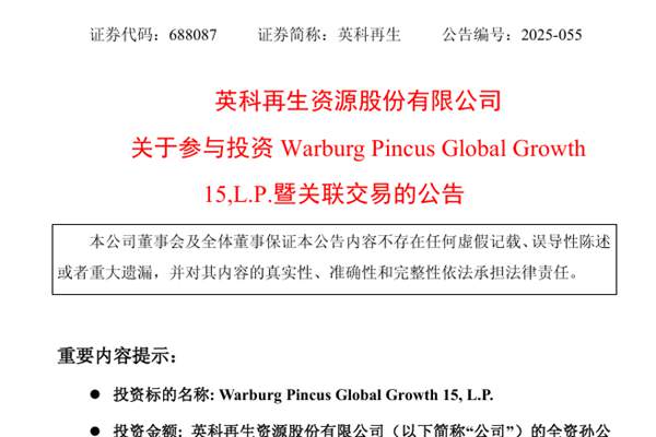 英科再生资源股份有限公司(简称:英科再生)近日公告称,为进一步优化投资结构,提升公司全球战略布局,借助专业化投资管理团队,提升公司收益水平与长远战略发展,公司全资孙公司英科环保国际(香港)有限公司(下称“英科环保国际”)拟与Warburg Pincus Global Growth 15 GP, L.P.(以下简...