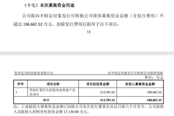 2025年05月31日,苏州迈为科技股份有限公司发布《 向不特定对象发行可转换公司债券预案》。图源:迈为股份公告 本次拟发行可转换公司债券募集资金总额不超过人民币196,667.52万元,扣除发行费用后拟用于钙钛矿叠层太阳能电池装备产业化项目,而该项目拟投资金额为213,797.52万元。 公告也表示,项目总投资金额高于本次募集资...