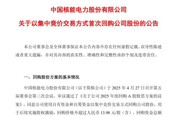 2025年05月30日,中国核能电力股份有限公司发布《关于以集中竞价交易方式首次回购公司股份的公告》。图源:中国核电公告 2025 年5月29日,公司通过集中竞价交易方式首次回购股份3,847,200股,已回购股份占公司总股本的比例为0.02%,成交的最高价为9.65元/股,成交的最低价为9.58元/股,已支付的总金额为36,980...
