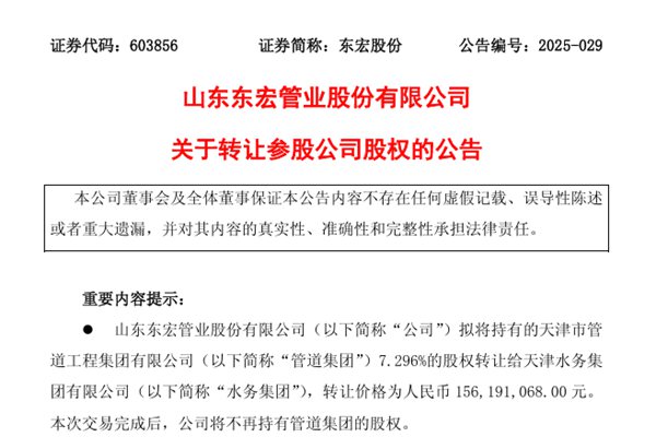 山东东宏管业股份有限公司(简称:东宏股份)近日公告称,公司拟将持有的天津市管道工程集团有限公司(下称“管道集团”)7.296%的股权转让给天津水务集团有限公司(下称“水务集团”),转让价格为人民币156,191,068.00元。本次交易完成后,公司将不再持有管道集团的股权。 东宏股份表...