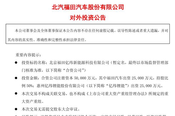 2025年05月27日,北汽福田汽车股份有限公司发布《对外投资公告》。图源:福田汽车公告 为拓展新能源重卡业务,为客户提供多样化的电池租赁解决方案,支持动力电池降本,提高新能源重卡利润率,公司拟与亿纬锂能共同出资设立合资公司。合资公司注册资本为50,000万元人民币,其中,公司以自有资金出资25,000万元,持股比例为50%;亿纬锂...